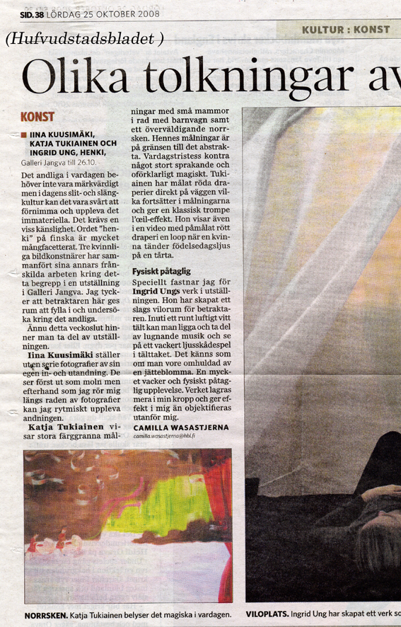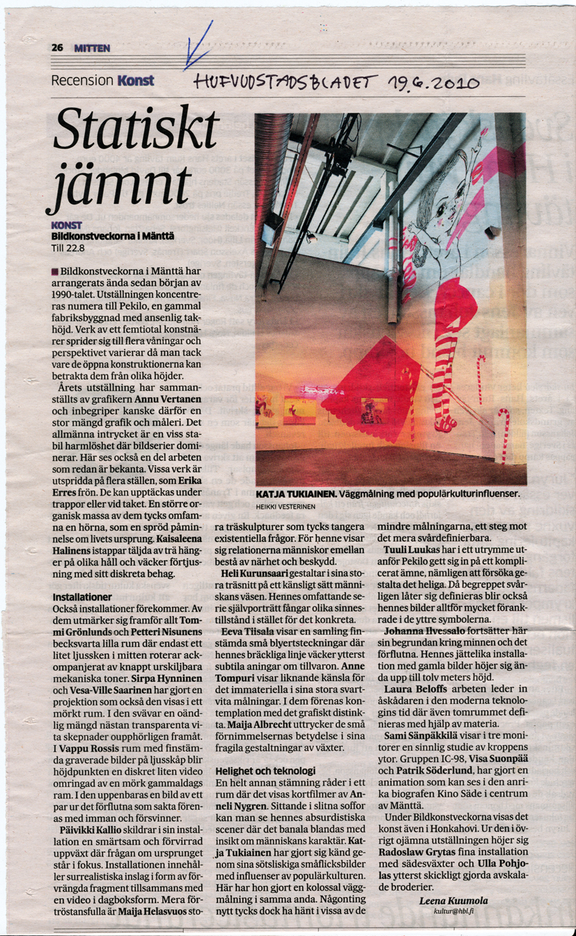 Beautiful new article about Katja Tukiainen's art is published at Osaka (Japan) based Aatonau platform 26.9.2025. Selected articles & reviews 2024: Radio Helsinki interview: Katja Tukiainen by Anna Cadia x HAM, 29th of May, 2024. Kulttuuritoimitus about Katja Tukiainen's exhibition Circus at Finlayson Art Area, Tampere, summer 2024. Liina V. from Helsingin Suomalainen Yhteiskoulu writes about Katja Tukiainen's painting called Pajunkissa. Selected articles & reviews 2022: Visual artist, painter Katja Tukiainen's doctoral thesis for Doctor of Fine Arts in Academy of Fine Arts, Helsinki, took place Friday 6th of May 2022, 11 am. The interview page here. Thesis written part, the book Katja Tukiainen: Tyttöarmeija, kerronnallinen maalaus tilassa (Academy of Fine Arts, University of the Arts Helsinki, 2022) PDF is here. The synopisis / abstract is in English page 8 and Swedish page 7. And here is the link to Katja Tukiainen's thesis examiner PhD Katve-Kaisa Kontturi's article about the book. Kontturi's article is published in SQS Vol. 16 No 1/2022. Selected articles & reviews 2021: Katja Tukiainen happily announces that she is part of the Finnsih Painters project! Selected articles & reviews 2018: Pink Thinking of Katja Tukiainen, by Hanna Heiskanen Scan Magazine, September 2018 / page 106 Selected articles & reviews 2017: STEP INTO A GIRLY WORLD FOR A WHILE, by Saskia Gullstrand, 2017 Selected articles & reviews 2016: Artnet news about ArtHelsinki and Katja Tukiainen, 9.9.2016, article by Emily Nathan Russo, Francesco: A Rom a il 'luna park abbandonato' di Katja Tukiainen, AGI, Italia, 23.5.2016 La rivoluzione estetica di Bansky approda in Sicilia, Sicilia Journal, 4.6.2016, Sicily, Italy, http://www.siciliajournal.it Selected articles & reviews 2015: Päivi Kiiski about P is for Paradise Asta Kihlaman about P is for Paradise in Turun Sanomat Kaisa Viljanen about P is for Paradise in Helsingin Sanomat Selected articles & reviews 2013: Katja Tukiainen and the Art of the Uncanny "Katja Tukiainen’s art transcends a recent description of it as a contemporary version of Pop. While the affinity is arguably there, there is a confluence of sources in Tukiainen’s art that distinguishes it from a style half a century old. Tukiainen’s aesthetic is not the only thing that differentiates her work from the past, however; for her narratives set it apart from subject matter often associated with Pop. It may be the diversity of media in Tukiainen’s practice that first and foremost resists categorization; for her corpus is heterogeneous evinced in the numerous genres she works in: painting, work-on-paper, sculpture, video, comics, installation and a mixture of these. Tukiainen’s formal plurality is only equaled by her myriad themes." – Raul Zamudio, New York City 2013 READ THE WHOLE ARTICLE The whole article is in monography book Katja Tukiainen WORKS PART TWO in English and Finnish, with Riiko Sakkinen's foreword and Katja Tukiainen's Artist's words, full colours & hardcover, 216 pages, text in english & finnish) published by Parvs Publishing. ”Katja Tukiaisen taide on paljon enemmän kuin vain nykyaikainen versio poptaiteesta, kuten se on hiljattain määritelty. Vaikka sukulaisuutta onkin havaittavissa, Tukiainen ammentaa niin monesta lähteestä, että hänen tuotantonsa poikkeaa selkeästi tuosta puolen vuosisadan takaisesta taidesuunnasta…Luultavasti ennen kaikkea Tukiaisen käyttämien tekniikoiden suuri määrä saa aikaan sen, että hänen taiteensa pakenee luokitteluja. Tukiaisen tuotannon heterogeenisyys ilmenee hänen moninaisissa työskentelytavoissa: maalauksissa, paperiteoksissa, veistoksissa, videoissa, sarjakuvissa ja installaatioissa sekä teoksissa, joissa hän yhdistelee näitä. Tukiaisen monialaisuudelle vetää vertoja vain hänen teemojensa runsaus.” – Raul Zamudio, New York City 2013 Artikkeli on luettavissa kokonaisuudessaan myös suomenkielellä kirjassa Katja Tukiainen WORKS PART TWO. Kirjassa on Riiko Sakkisen esipuhe ja Katja Tukiaisen taiteilijan sanat. Kirja on nelivärinen, kovakantinen ja 216 sivuinen. Kustantaja on Parvs Publishing. Review by Harri Römpötti: Helsingin Sanomat, 30.11.2013, in Finnish Article by Charlie Levine: "Did pop kill art?" by Carlie Levine at Artfetch.com, 19.2.1013. Selected articles & reviews 2011: Article by Jacquelyn Gleisner about Katja Tukiainen's art at art:21 blog May 18th, 2011. Selected articles & reviews 2010: ArtStars*s Nadja Sayej says Katja was cheeky for one moment, July 2010. Anssi Kasitonni - Jani Leinonen - Katja Tukiainen, 8140 kg, art critic in Helsingin Sanomat 14.7.2010 by Veikko Halmetoja. The same in ENGLISH here. Leena Kuumola in Hudvudstadsbaled 19.6.2010 about Mänttä Artweek and Katja Tukiainen's Paradis a. Katja Tukiainen GENERAL PINK / KENRAALI PINKKI, finnish article by Tiia Lappalainen in Matkaan magazine (VR, 4-2010). Selected articles & reviews 2009: Mikko Oranen's article about Katja Tukiainen Exhibition Playground (2009) at Skenet.fi. Heidi Valkola's article about Katja Tukiainen Exhibition Playground (2009) at We Love Helsinki. Exhibition